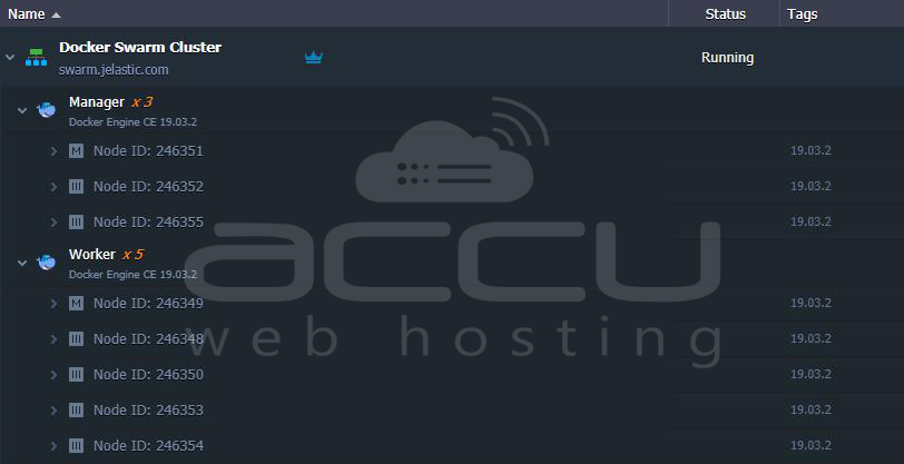 Another advantage of hosting your swarm cluster on AccuWeb.Cloud PaaS is the automatic and even distribution of all containers across the available host nodes (physical servers) on the platform. This guarantees exceptionally high availability for your application.