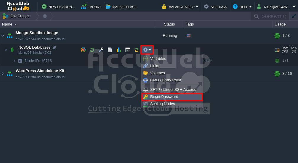 Step 2: Select your environment, click the Gear icon (Settings) next to the NoSQL Database, and choose Reset Password.