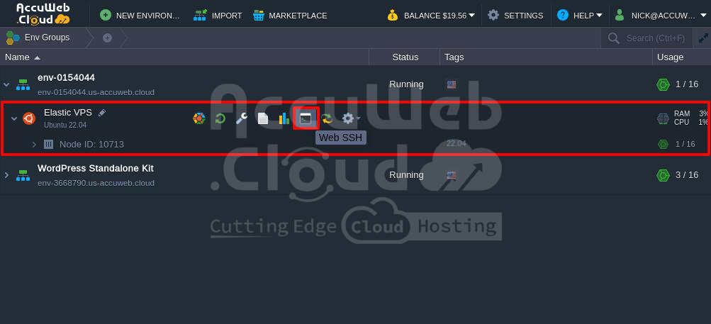 Step 2: Select your environment and click Web SSH next to the Elastic VPS.